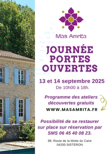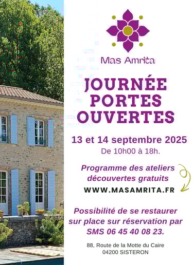 🤝Le Mas Amrita et ses intervenants(es) sont très heureux de vous proposer de venir aux Journées Portes Ouvertes, du 13 et 14 septembre 2025 (10h-18h) pour découvrir les activités proposées. Vous pourrez participer aux ateliers prévus à cette occasion.